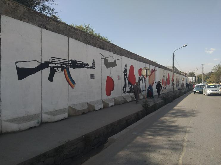 Стоит пояснить — в центральной части Кабула образовались бетонные лабиринты из-за того, что правительственные комплексы и посольства, расположенные в этой части города, были огорожены глухими бетонными блоками, чтобы защитить их от атак террористов и подрыва заминированных автомобилей. Таким образом, вдоль центральных улиц возникли высокие серые коридоры. Местные художники решили разукрасить эти стены, чтобы они не смотрелись столь мрачно.