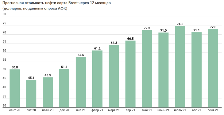 Во второй половине 2020 респонденты стабильно прогнозировали, что через год стоимость Brent будет составлять около 50 долларов за баррель.