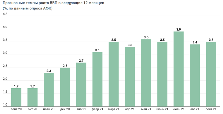 «По мнению экспертов, рост ВВП страны через 12 месяцев может составить 3,5% (тек. 2,7%). По итогам 2022 года МНЭ РК ожидает ускорение показателя до 4,1%, S&P – 3,6%.», — отмечают в Ассоциации финансистов Казахстана.