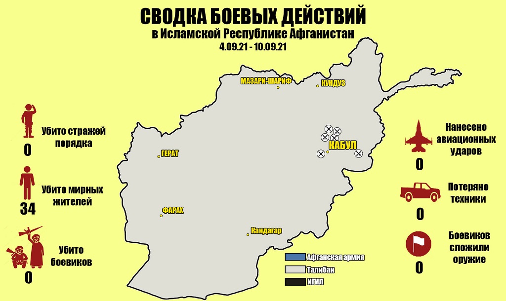 За прошедшую неделю в Афганистане значительно сократилось количество боевых действий. Движение «Талибан» захватило власть в республике и взяло под свой контроль всю территорию республики. Провинция Панджшер, в которой находился Фронт Национального Сопротивления также была захвачена.