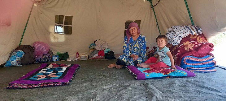 Палаточный лагерь для пострадавших от селя развернули в селе Кара-Дарыя. Среди них есть маленькие дети и беременные женщины. Дом Анзират Абдразаковой тоже затопило и он пришел в негодное состояние. Сейчас она с четырьмя детьми живёт в палатке. Муж уехал в Россию на заработки.