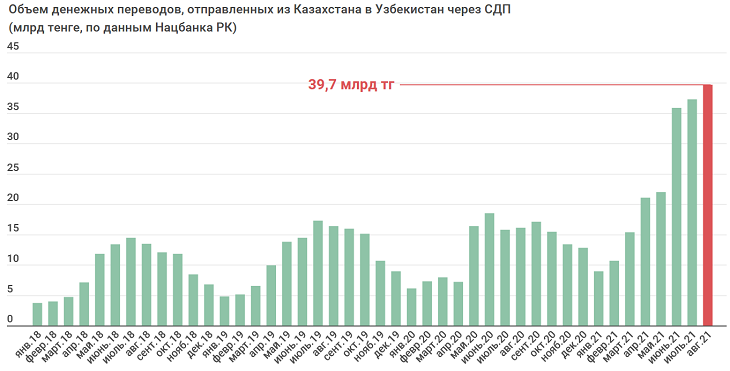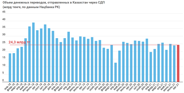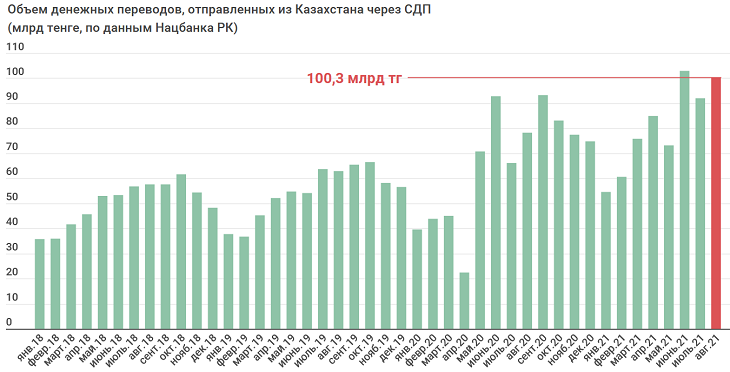 По данным Нацбанка, в августе 2021 года через системы денежных переводов (СДП) казахстанцы отправили за рубеж 100,3 млрд тенге. По сравнению с июлем объем переводов вырос на 8,3 млрд тенге. Причем нынешний показатель один из самых больших за все время. Больше средств за месяц уходило только в июне 2021 (103 млрд тенге).