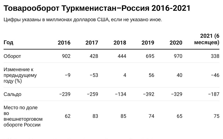 Тенденция к росту экономического сотрудничества между Туркменистаном и Россией связана не только с углеводородами. В последние годы наблюдается устойчивый рост товарооборота, не связанного с природным газом. В 2020 году, несмотря на замедление мировой экономики, вызванное пандемией коронавируса, эта торговля выросла на 40% и достигла рекордной отметки в 970 миллионов долларов США. В то же время, как показывают цифры, расширение негазовой торговли приводит к росту отрицательного торгового баланса Туркменистана. Таким образом, эта цифра указывает на то, что экономика Туркменистана остается крайне недиверсифицированной и мало что может предложить, кроме углеводородов.