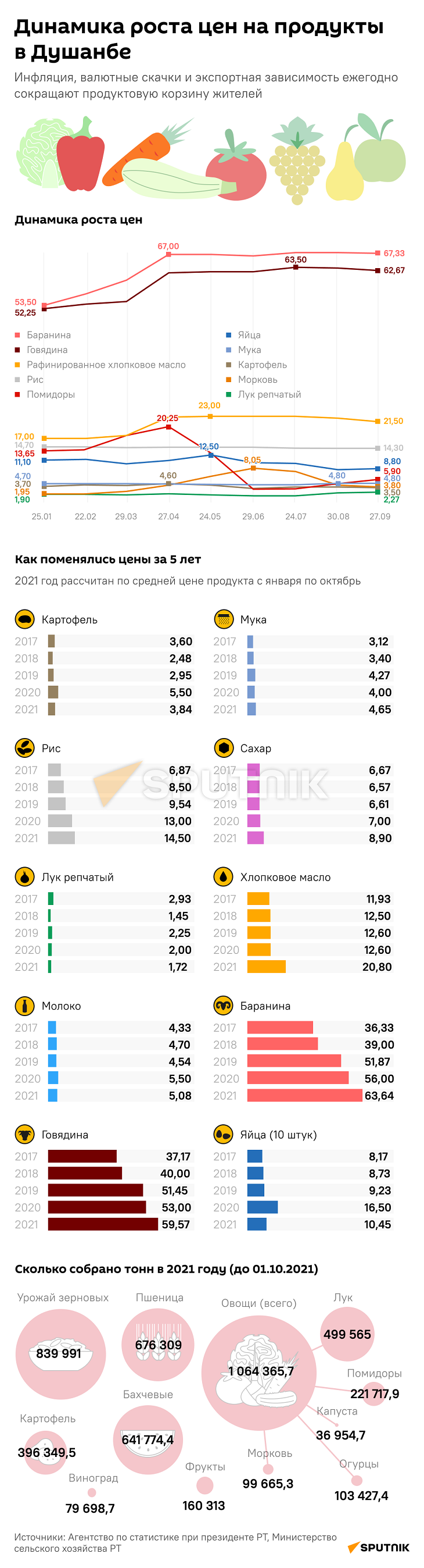 Хотя коронавирусная паника в Таджикистане давно прошла, цены на продовольственные товары продолжают идти вверх. Так, с начала 2021 года в Таджикистане подскочили цены на баранину (с 53,50 до 67,33 сомони) и говядину (с 52,25 до 62,67 сомони).В середине 2021-го подорожало масло - до 23 сомони, однако в итоге спустилось до 21,50.