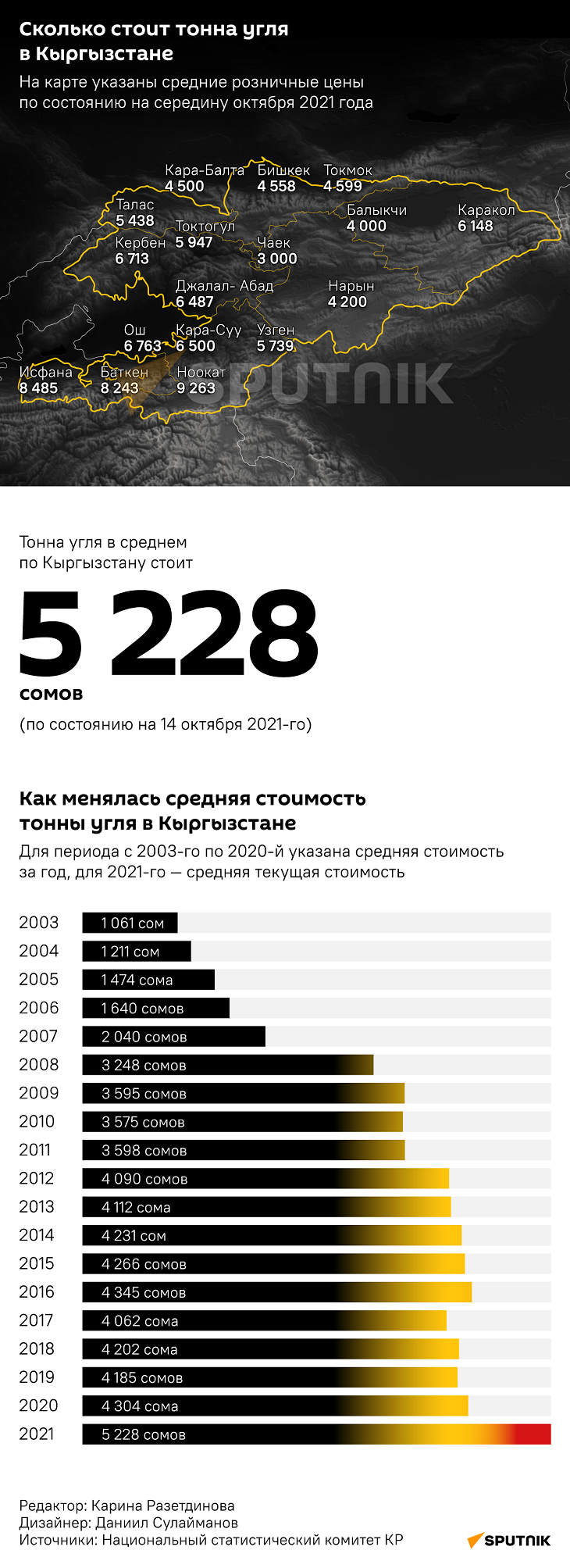 По данным Нацстаткома, средняя стоимость тонны угля, актуальная на середину октября, составила 5 228 сомов. По сравнению с октябрем прошлого года цены на рынке выросли почти на 18 процентов, или на 794 сома.