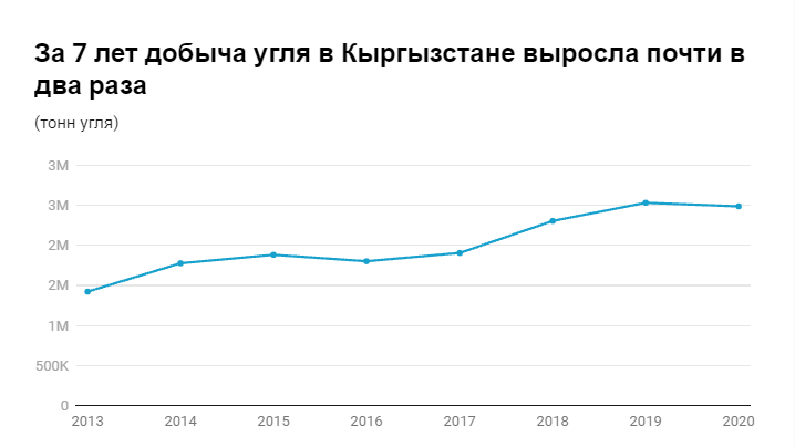 Пик добычи угля в Кыргызстане был в 1979-1990 годах и достигал отметки в 4 млн тонн в год. В советский период республику называли «кочегаркой Средней Азии». В начале 90-х в связи с приобретением независимости и переходом к рыночной экономике негативные трансформации произошли и в угольной отрасли.