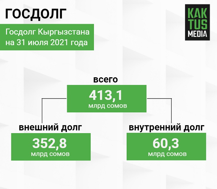 По данным на 31 июля 2021 года, государственный долг Кыргызстана составил 413,1 млрд сомов ($4,9 млрд). 60,3 млрд сомов - это внутренний долг и 352,8 млрд сомов - внешний. Почти 150 млрд сомов из внешнего долга - это долг перед Китаем.