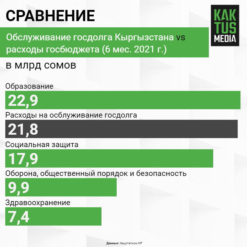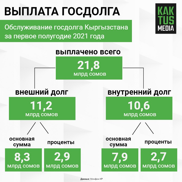 За январь-июль 2021 года из республиканского бюджета на обслуживание госдолга было направлено 21,8 млрд сомов, 5,6 млрд сомов из этой суммы составляет выплата процентов.
