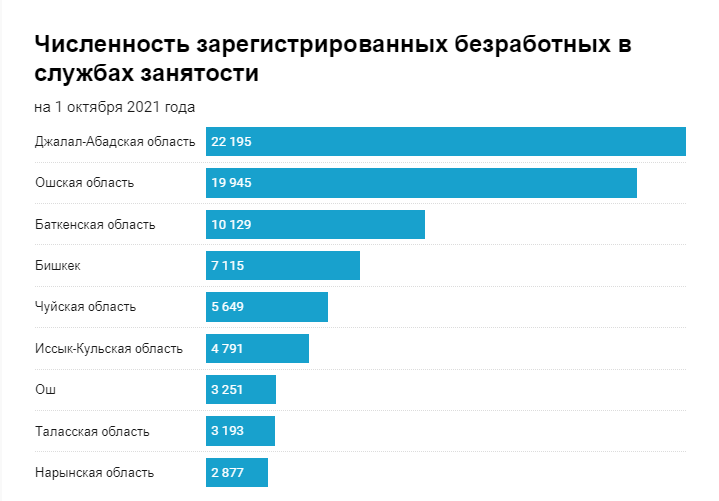 Самое большое число безработных зафиксировано в Джалал-Абадской области, где без постоянного места работы значится 1.79% населения области, или 22 тысячи 195 жителей. Меньше всего в службах занятости зарегистрировано в Нарынской области (2 тысячи 877) – 0.9% от общей численности населения.