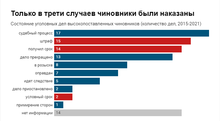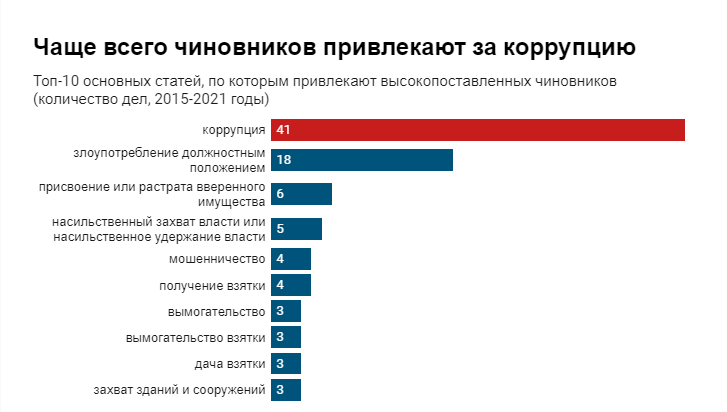 Девять из десяти всех возбужденных дел против высокопоставленных чиновников связаны с незаконным обогащением. 41% дел — возбуждены по статье коррупция.