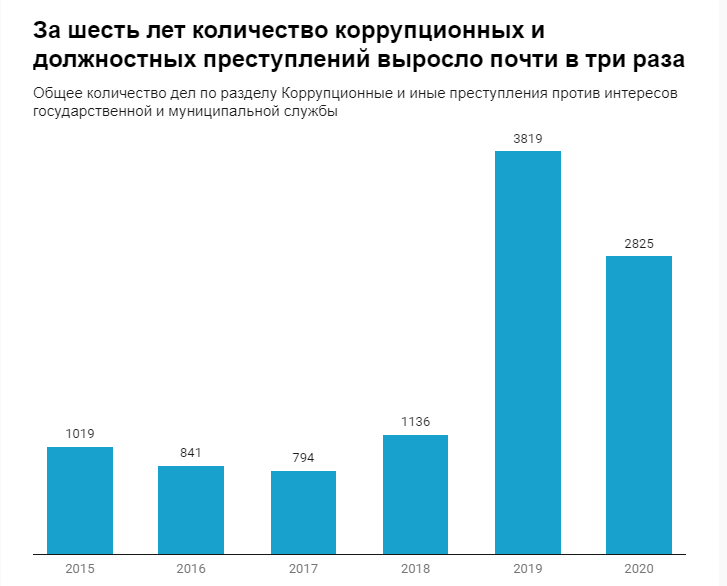 По данным Генпрокуратуры за последние шесть лет, количество коррупционных и других преступлений против интересов государства выросло почти в три раза. А в 2020 году в среднем совершалось пять коррупционных преступлений в день.