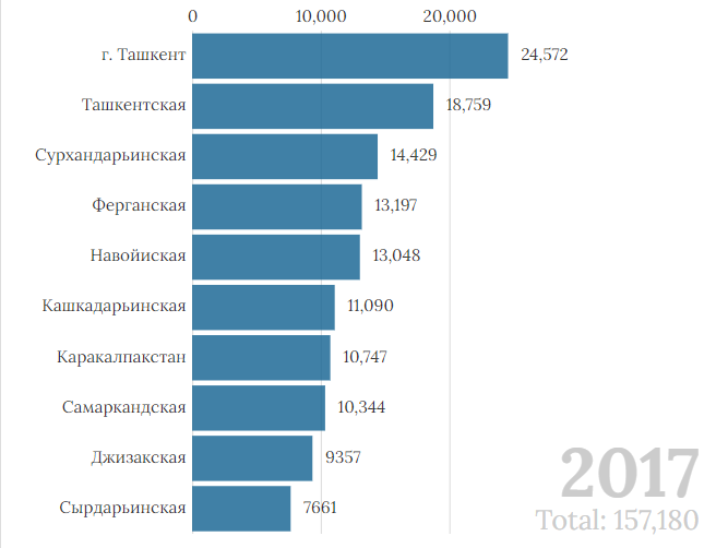 В 2016—2017 годах лидерами по количеству выбывания были Ташкентская, Самаркандская, Сурхандарьинская области и Республика Каракалпакстан.
