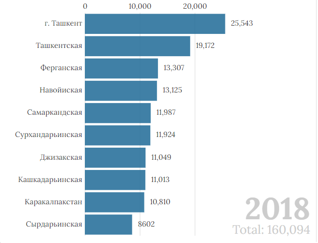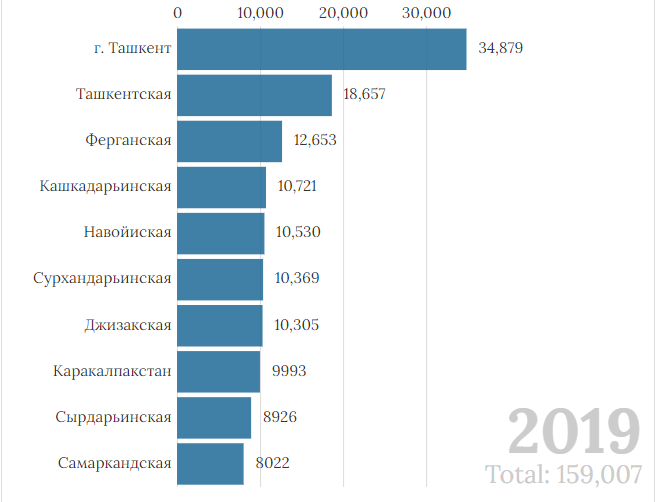 В 2018—2019 годах — Самаркандская, Кашкадарьинская, неизменным остается только показатель Ташкентской области.