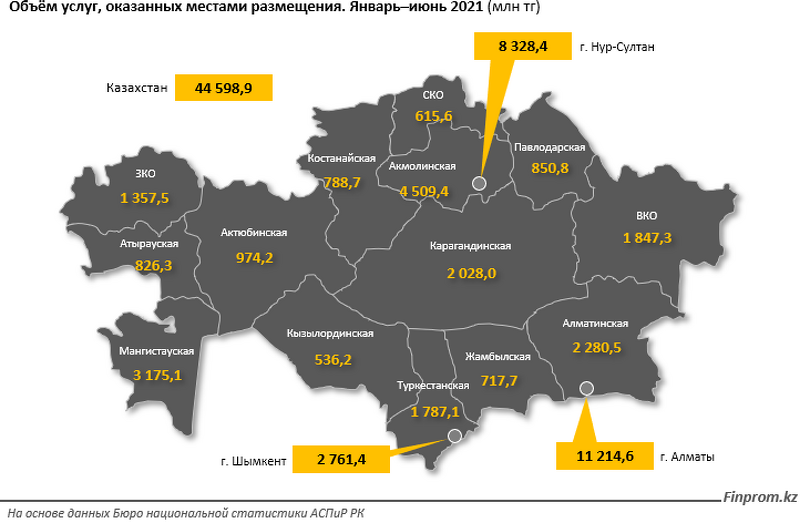 В целом по РК объём услуг, оказанных местами размещения за январь – июнь текущего года, составил 44,6 млрд тенге. Лидерами стали Алматы (11,2 млрд тенге), Нур-Султан (8,3 млрд тенге) и Акмолинская область (4,5 млрд тенге).