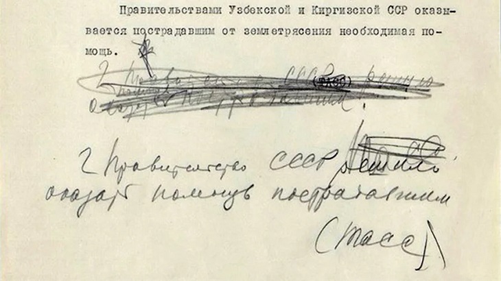 Из проекта сообщения ТАСС «Землетрясение в районах Средней Азии», переданного по ВЧ И. В. Сталину, 5 ноября 1946 года.