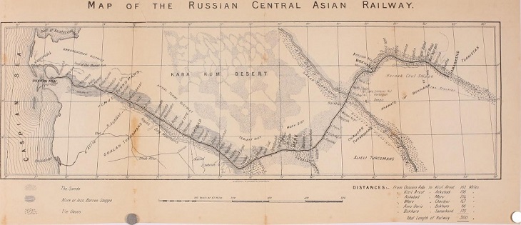 Строительство центральноазиатской железной дороги в свое время начали для того, чтобы утихомирить текинцев (одно из крупнейших племен, проживающих в Туркменистане, прим. ред). Для достижения этой цели был построен специальный стратегический отрезок дороги от прикаспийского поста в Красноводске (нынешний Туркменбашы, прим. ред) до оазиса около Кизыл Арвата (нынешний город Сердар, прим. ред).