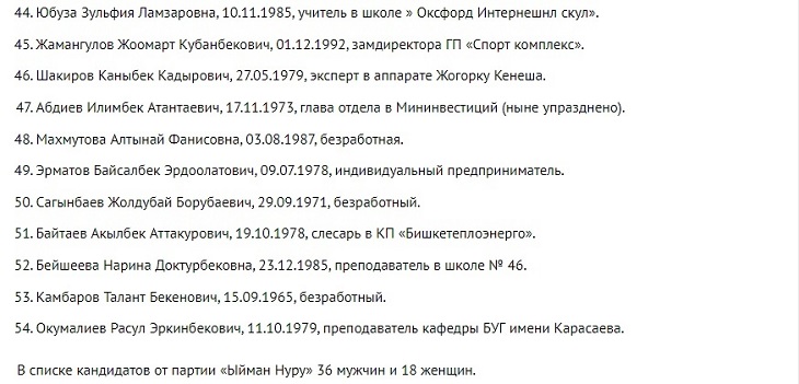 В целом в партии много экспертов из Жогорку Кенеша и бывших госслужащих. Остальные персоны, скорее, включены в список политобъединения для формирования гендерной и национальной квоты.