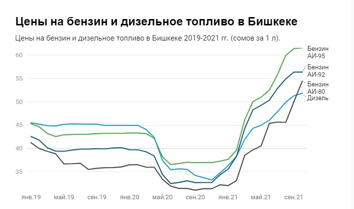 Согласно данным Национального статистического комитета, средняя цена бензина марки АИ-92 в январе составляла 35,91 сома за литр, в июне - 50,24 сома, в октябре - 57,09 сома (+21 сом, или +58,9% с начала года). Стоимость бензина АИ-95 - 37,78; 52,31; 61,62 сома соответственно (рост - 24 сома, или +63%). Дизельное топливо в январе стоило 36,34 сома, в июне - 45,82 сома, в октябре - уже 52,02 сома (+15,68 сомов, или +43,15%).