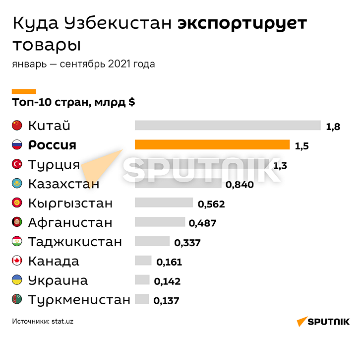С января по сентябрь этого года, по данным Госкомстата, Узбекистан экспортировал в Россию продукцию на общую сумму $1,5 млрд. В основном страна закупает у республики текстиль, обувь, продовольственные товары, сельскохозяйственное сырье, каучук, металлы и изделия из них.