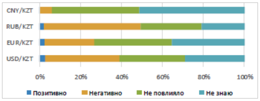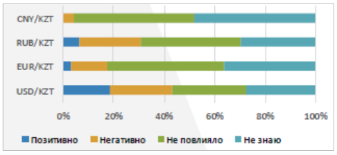 При этом опрошенные заявили, что наименьшее негативное влияние на свою хозяйственную деятельность испытывают от изменения курса юаня к тенге. На позитивное влияние от изменения обменного курса валют в минувшем квартале указали большей частью предприятия-экспортеры, тогда как на негативное воздействие оказывает изменение курса тенге к рублю.
