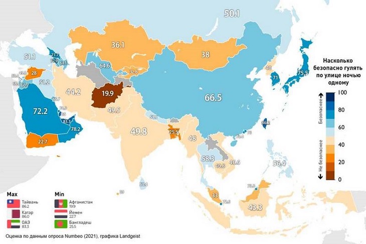 В полной безопасности себя ощущают жители тройки лидеров: Тайвань (86,2), Катар(86) и ОАЭ (83,3).
