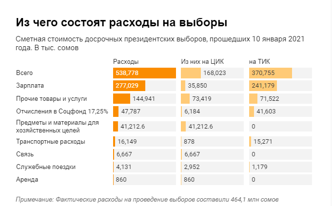 По данным ЦИК, на выборы фактически потрачено 464,1 млн сомов. Было изготовлено 3 млн 567 тысяч бюллетеней, исходя из чего расходы на одного избирателя, по подсчетам избирательной комиссии, составили 130 сомов. Судя по явке, которая составила 39,7%, каждый проголосовавший обошелся бюджету в 330 сомов.