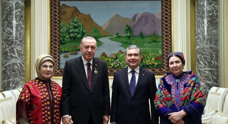Первая леди Турции Эмине Эрдоган, президент Турции Реджеп Тайип Эрдоган, президент Туркменистан Гурбангулы Бердымухамедов и первая леди Туркменистана Огулгерек Бердымухамедова.