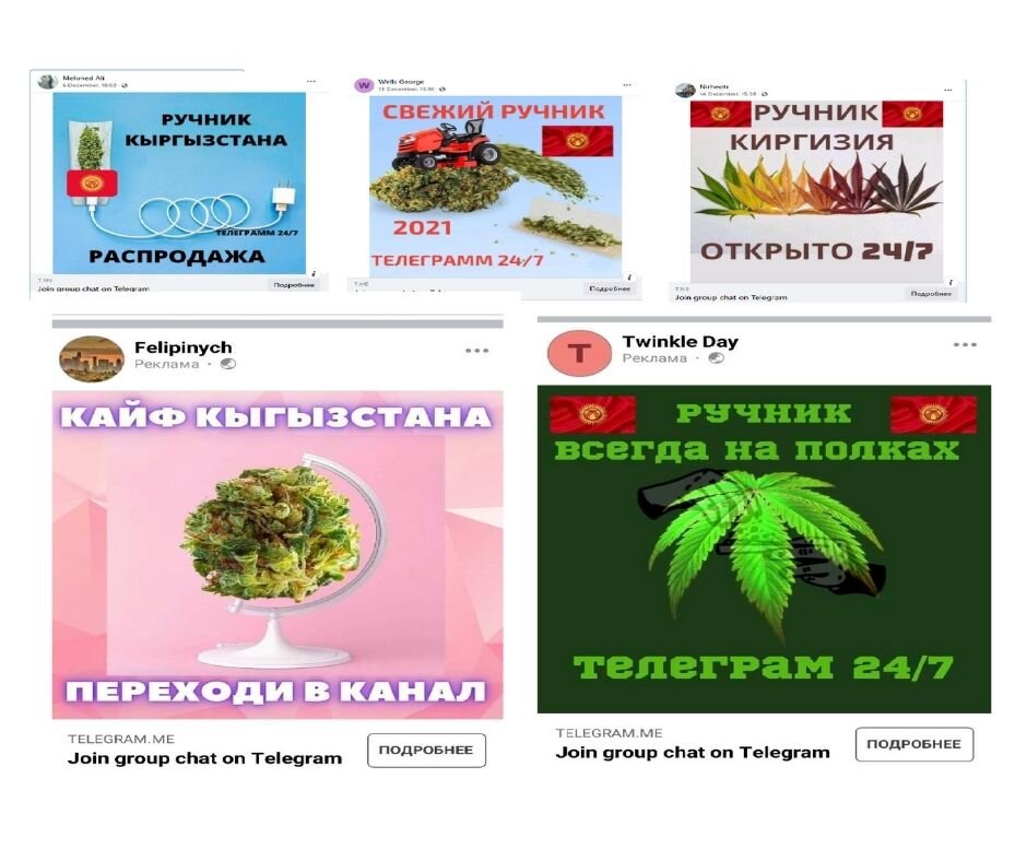 «Ручник» – одно из наименований гашиша. Этот наркотик реклама преподносит как прямо-таки национальный продукт Кыргызстана – изображение флага республики наркоторговцы лепят на картинки сплошь и рядом (хотя порой и название республики грамотно написать не могут!). Рекламные посты на «Фейсбуке» они всякий раз размещают с новых аккаунтов. Главную же информацию пользователь получает, перейдя по ссылке на телеграм-канал.