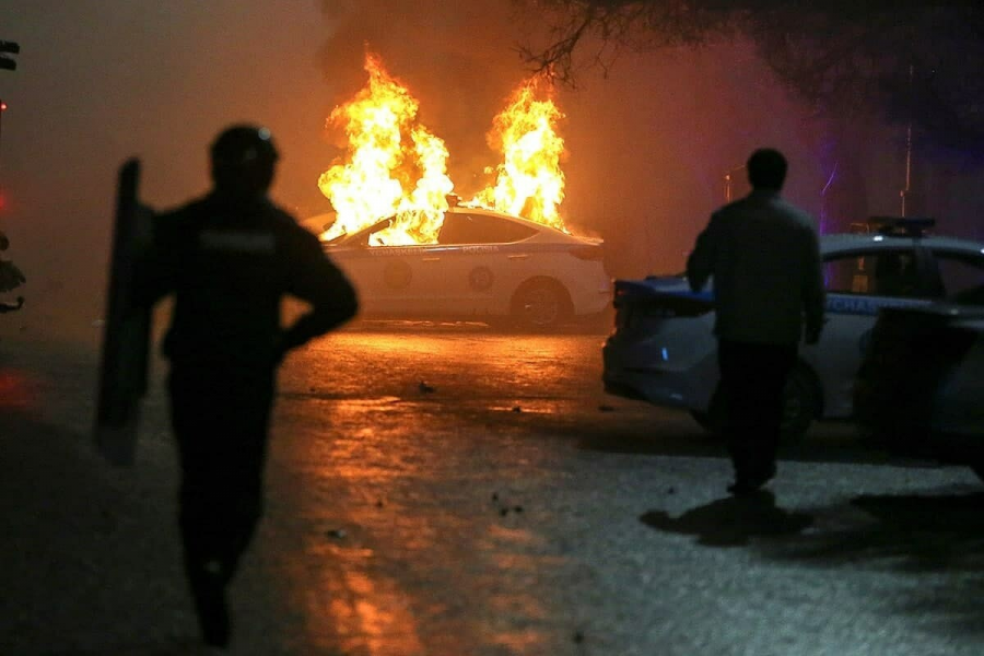 Эскалация насилия протестующих в Алматы набирает обороты. Хулиганствующие молодчики поджигают технику полиции.