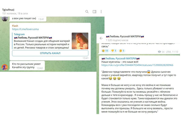 27 февраля в этих чатах просят «разогнать» группу с названием «Любовь русской матери». Пока я писала, ссылка на эту группу несколько раз появилась в комментариях к моим постам в Telegram-канале со словами: «Здесь вы узнаете правду!».