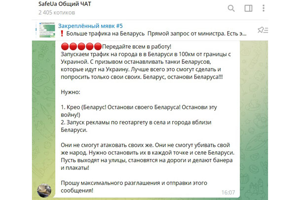 Еще одно направление инфовоинов – Белоруссия. Лить «крео» предлагается в города, расположенные в пределах 100 км от границы с Украиной, это связано с возможностью вмешательства Белоруссии в военную операцию на территории Украины. В чате утверждают, что это прямой запрос от украинского вице-премьера Михаила Федорова, IT-предпринимателя, основателя цифрового агентства, что дает возможность предположить, что деятельность многочисленных чатов «инфоволонтеров» связана именно с ним.