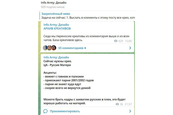 Архив «крео» висит в соответствующих чатах. На любую целевую аудиторию: для России, для Белоруссии, для Запада, для Украины – архивы огромны, и подходящий «мемчик» или, наоборот, драматическое видео можно найти на любую задачу. Этим занимаются дизайнеры и текстовики.