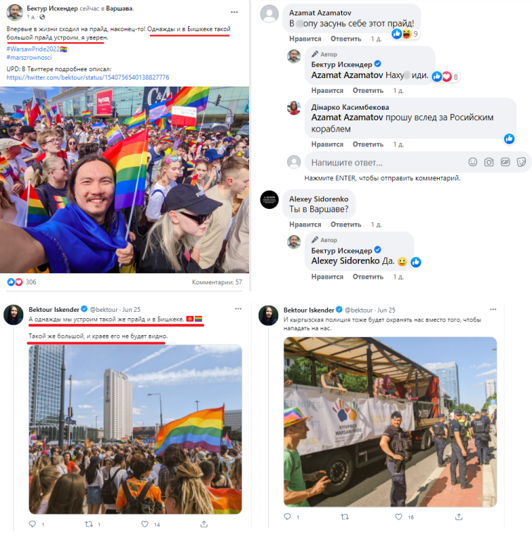 Что же касается Кыргызстана, то в варшавском гей-параде участвовал небезызвестный Бектур Искендер, сооснователь кыргызстанского издания «Клооп». В соцсетях он написал об этом чуть ли не как о главном событии в своей жизни: