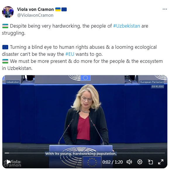 Немецкая депутатка Европарламента с заковыристо-затейливым именем Виола фон Крамон-Туабадель пожалела узбеков: им приходится страдать из-за близости двух кровавых тоталитарных стран, России и Китая, а также посетовала на постоянное нарушение прав человека и токсичную пыль в Узбекистане. В общем, смешались в кучу кони, люди…