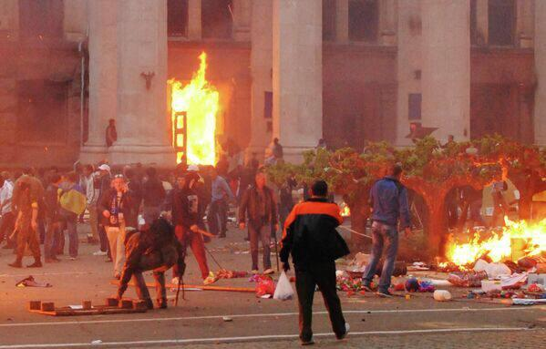 «Когда в Дом профсоюзов заходил последний десяток человек, на площадь с воем и дикими криками ворвалась лавина обезумевшей толпы фашистских молодчиков, – рассказывает один из свидетелей и участников событий, член организации офицеров Одессы «Честь имею» Юрий Трофимов. – Сразу же полетели камни, бутылки с зажигательной смесью, послышались выстрелы и взрывы петард, которые были усилены гвоздями. Из стеклянного здания напротив стрелял снайпер. Один мужчина тут же на крыльце упал с пулевым ранением в грудь… Нам всем пришлось укрыться внутри здания, но обороняющихся было очень мало и оказать противодействие по всем входам они не смогли. Большая толпа укронацистов вломилась в один из задних боковых проходов и по лестнице резко забежала на 3-4 этажи здания. Они были вооружены пистолетами, были в бронежилетах и сразу стали забрасывать бутылками с зажигательной смесью и хлороформом здание изнутри.