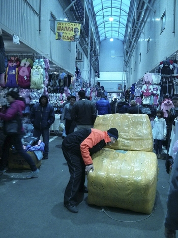 У продавцов шапок я заранее развязываю тележку и тут же начинаю завязывать. Парень загружает вещи, мы с ним общаемся на таджикском, он слышит мой акцент и очень радуется, что таджик так хорошо говорит по-русски. Показывает мне, как завязывать большие тюки, залепляет скотчем и желает удачи. Проходящие мимо молодые грузчики смотрят на меня, здороваются, улыбаются.