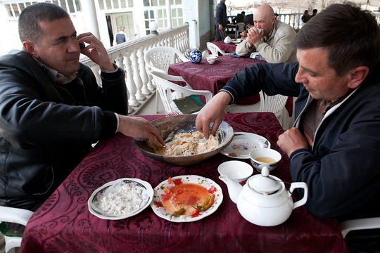 В "Ходжиёне" также подают основные центральноазиатские блюда, такие как шурпа – наваристый суп из баранины с картофелем, плов из риса и мяса и манты с мясной начинкой. Причем каждое блюдо отличается своим, местным, колоритом. Так, например, плов в Таджикистане нередко готовят с курагой и морковью. "Плов – как ислам, – объясняет пожилой посетитель чайханы. – У каждого он свой".