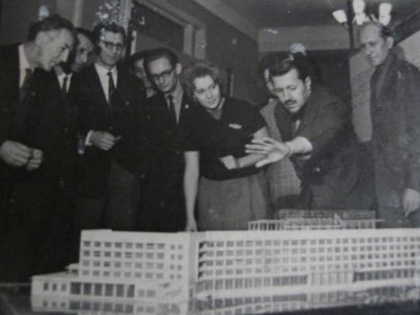 Душанбе, 1971 год. Обсуждение генерального плана Душанбе. На снимке: слева- направо - архитекторы Т. Терещенко, П. Зубов, С. Самонина, В. Бирюков, Иван Ткачёв – главный архитектор г. Душанбе, Всеволод Веселовский - председатель Союза архитекторов Таджикистана, первый зампредседателя Госстроя Таджикской ССР.