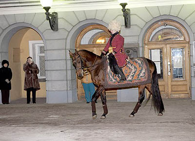 Гнедой жеребец из учебно-опытного манежа Московской сельскохозяйственной академии имени Климента Тимирязева поразил собравшихся величием природного совершенства. В холодный даже по меркам российской зимы вечер (термометры показывали минус 17 градусов по Цельсию) коня заботливо укрывала теплая попона, сшитая из туркменских войлочных ковров – кошм. Чувствуя себя в центре внимания, жеребец картинно позировал перед блицами фотокамер и прожекторами телевизионщиков, демонстрируя удивительную грациозность, которую нельзя было не встретить аплодисментами.