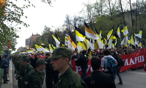 Около 50 сторонников Российской правой партии Владимира Истархова держали в руках знамена с символикой партии и скандировали антизападные и гомофобные кричалки. Активисты РОД несли растяжку «Вера! Раса! Традиция!». Затем двигалась группа из семи человек под флагом Национального союза. Ближе к концу шествия 22 человека несли гигантский имперский флаг - постоянный атрибут ультраправых мероприятий. Замыкала строй колонна «Русских».